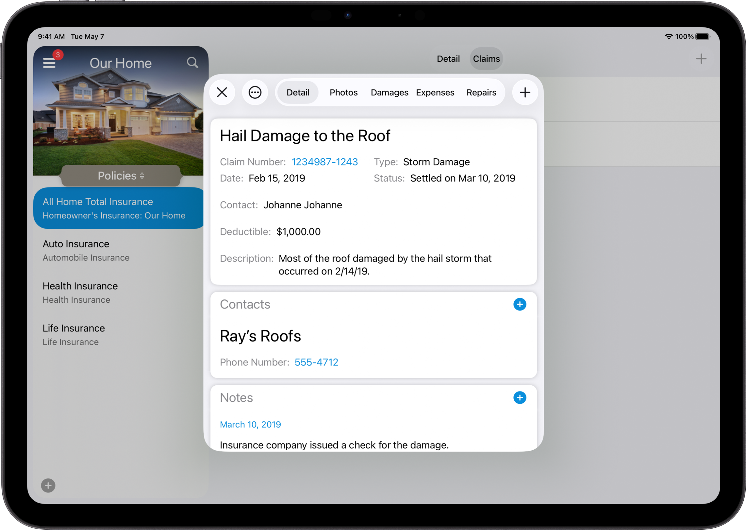 Enter your insurance policy and coverage information and Under My Roof will let you know if you are adequately insured. It can even handle coverage addendums for specific items, supports deductibles based on coverage categories, and maximum single item values.Should you ever need to file an insurance claim, Under My Roof can keep track of all of the relevant information regarding the process, including damage information and expenses. And not just for property-related claims either, you can also store policy and claim information for health, automobile, and other types of insurance.
