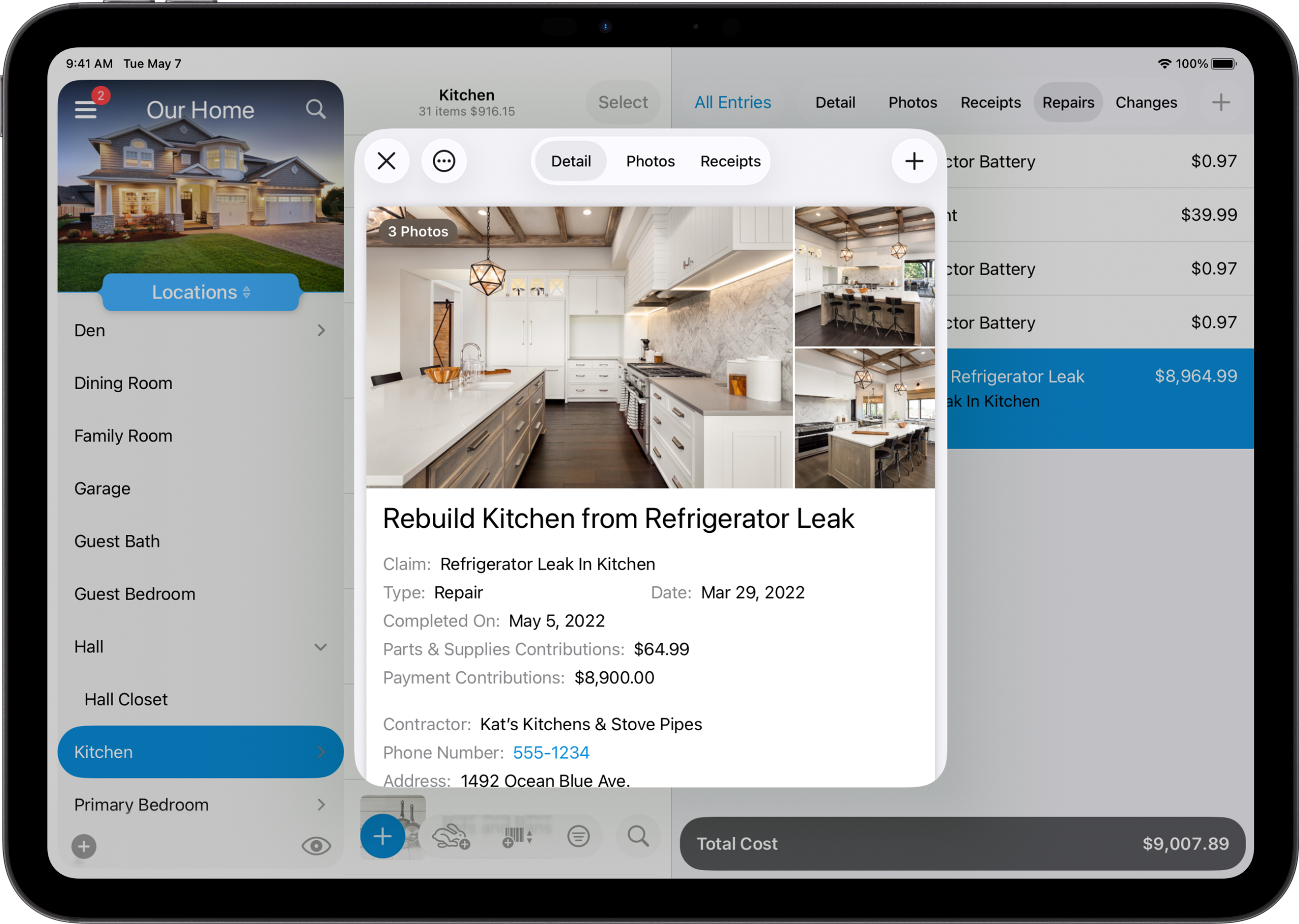 Keep track of any renovations or modifications you make to your home and belongings. Store contractor information, cost, before and after photos, and receipts. You can even keep track of the individual parts and supplies used.