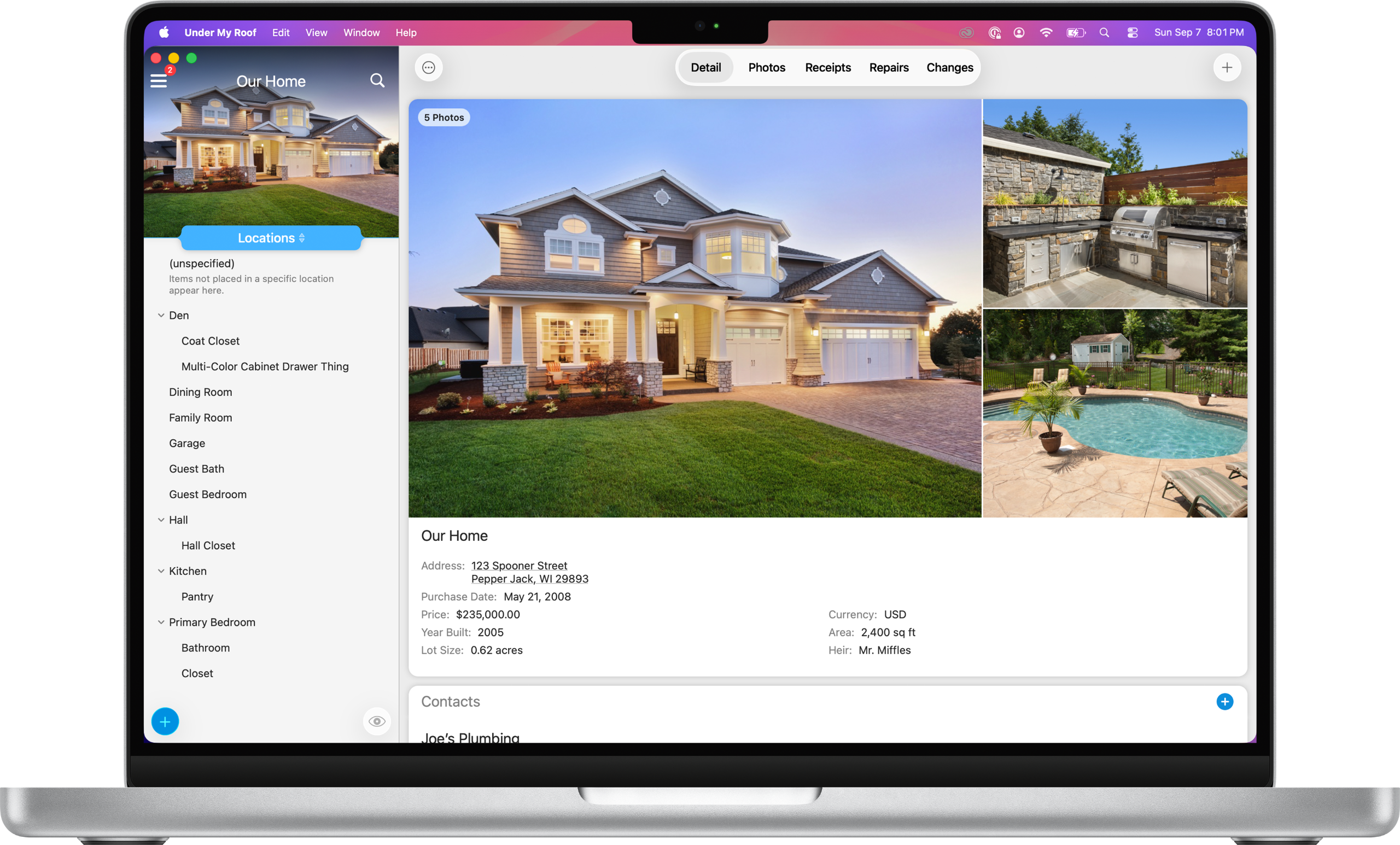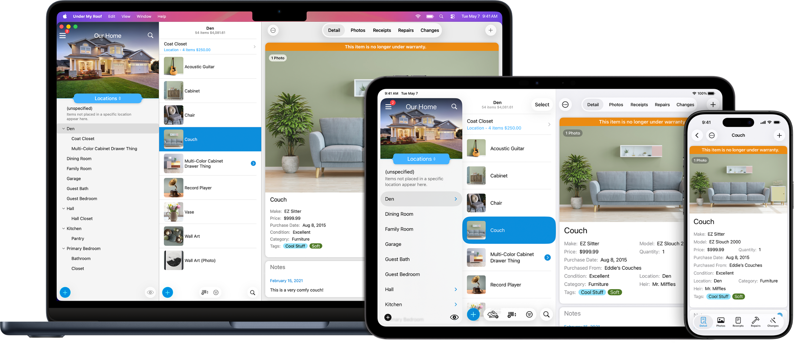 Keep your inventory in sync on your Mac, iPhone, and iPad using iCloud so it's there when you need it. Under My Roof requires iOS 14 (iPad and iPhone) and/or macOS 11 Big Sur (Mac).