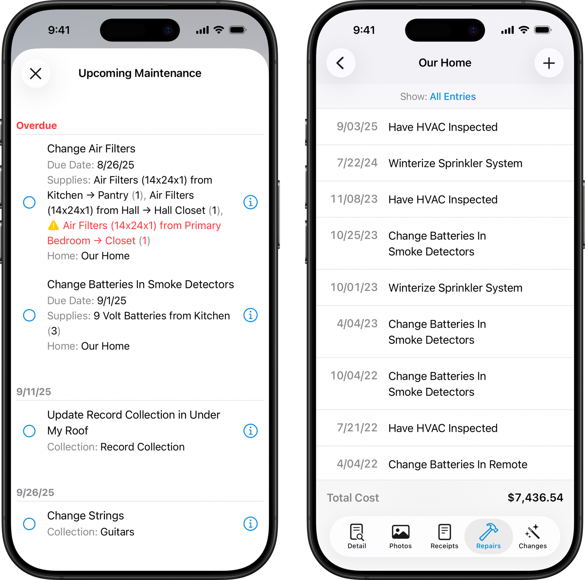 Create maintenance schedules for your home and any items that need them. You can also keep track of the maintenance and repair histories for your home and possessions.
